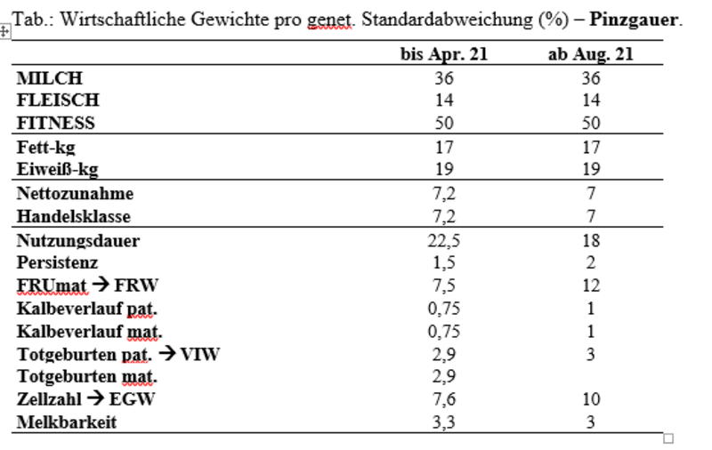 In den letzten paar Jahren wurden allerdings viele Weiterentwicklungen nicht sofort umgesetzt, um zu häufige Zuchtwert-Änderungen zu vermeiden. Bei der August-ZWS wurden diese Neuerungen für die Rassen Pinzgauer, Grauvieh, Gelbvieh und Vorderwälder gesammelt in die Routine umgesetzt. Im Folgenden werden die einzelnen Umstellungen dargestellt.