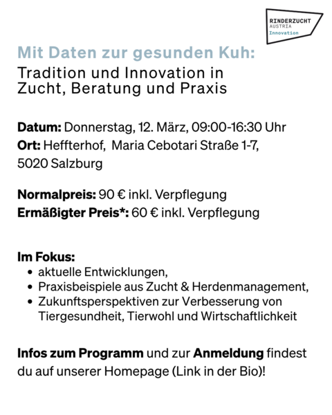 Alle Infos und das Programm findet man auf der Homepage der Rinderzucht Austria: Rinderzucht Austria Seminar - Offizielle Webseite der RINDERZUCHT AUSTRIA
